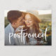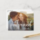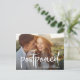 Modern vykort för uppskjutande av Bröllop-meddelande. Designen innehåller calligraphy-skript som täcker över vitt ("Senareled"), ditt foto och detaljer på baksidan.