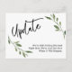 Framsidan har ett grafikhuvud som jag designat med ett modernt handskriftsteckensnitt som avslappnad "Uppdatera". Nedre, det finns ett glatt meddelande som du kan redigera och som förklarar dina nyheter: "Vi är fortfarande Gifta sig! Höger nu är vi inte säkra på när det kommer att hända." Med två vattenfärgssprickor av grönt lades lagrar till separat och lämnades olåst till ge för maximal designkontroll. Använda mallen fält att lägga till dina personuppgifter och ändra något av mitt förslag till formulering till kostym för dina behov och din situation.
