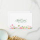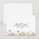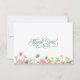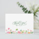 Enkel och söt typsnittsskrift, "Tack!" med svängiga linjer i medelgrön. Även om du kan ändra färgen hur du vill med knappen Redigera. Längst ner en vattenfärgillustration av blommor; rosa, orange, gula och grönska. Vit bakgrund fram och bak. Perfekt för en trädgårdsbröllopsfest, tehushållning eller födelsedag.