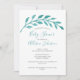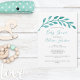 Ett vackert vattenfärgsvin från löv överlämnar evenemangets titel och dräktig mamma namn på denna enkla och ändå elegant duschinbjudan till strandbebisen.Denna vackra turkos botaniska inbjudan är klassande och minimalistisk för ett havsområde nära havet.elegantens typografi ger en chic vid en tillfälle på ön under sommaren.