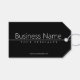 Enkel, vit text i klass på svart presentetikett