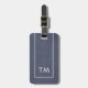 Elegant anpassadets blå bagagemärke med vit ram och fet monogram.