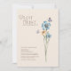 Det här roliga bröllopsinbjudan kombinerar minimal elegans med vildblomsblommor, blåa blommigtar och ett subtilt fjärilmotiv för ett unikt botaniskt tema.