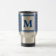 Du kan anpassa resemuggen med ditt monogram. Brev är blått. Bakgrunden har en blå strimmig mönster.