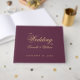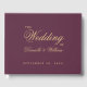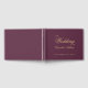 En enkel gästbok från bröllop med vin färg och elegant guldkalligrafi.