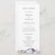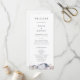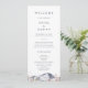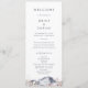 Detta enkla bröllopsprogram i blommigten är perfekt för ett utomhusområde bröllop. Den moderna minimalistiska utformningen har ett marint, blått vattenfärgsberg med rosa moody snäckor. Ta med namn i bruden och trimmen, datum och plats för bröllop, tack, serviceordning, brudens sida och ett minnesmärke "i kärleksfullt minne" som tillval.