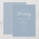 Den enkla kalligrafiinbjudan till bröllopskalligrafi för elegant innehåller dina bröllop-detaljer som är inställda i snyggtens vita typografi som är inställda på en dammig blå bakgrund. Baksidan har ett geometriskt dekorativt mönster. Designad av Thisisnotme©