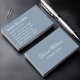 Ett enkelt affärskort med ett modernt färg: dammblått. Bakgrunden är dammig blå, texten är vit. På framsidan skrivs namn i ett kalligrafiskt skript för elegant. Resten av texten står i versaler.