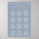 Ett enkelt sittdiagram i bröllop poster en modern utformning av eleganten med två brev monogram, namn och datum med nedanstående diagram, omgivet av ett tunt gräns. Mallen har tre kolumner med tolv bord av åtta gäster som exempel, men kan anpassas efter antalet bord och gäster. All text är vit över en dammig blå bakgrund och kan ändras till valfri färg genom att klicka på knappen "anpassa". En chic och snyggt bröllop-sätesutformning som är underbar för ett minimalistiskt par.