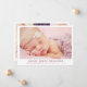 Enkelt stilren födelseanmälningskort med fotografi presenterar din lilla flicka med en stor landskapsbild på framsidan, inramad av en ren vit kant med klassiska serif-typsnitt och födelsedetaljer i rosafärg. Baksidan har en sex-fotografiers kvadratisk kollage med ett "Välkommen med kärlek"-meddelande från föräldrarna. Rosafärgen kan anpassas. All text är fullt redigerbar.