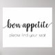 Det enkla svartvita vågrät "Bon Appetite Find Your Seat"-dusch, party eller bord-mottagningsskylt med en roligt, avslappnad handskript. Den klassiska designen innehåller ett modernt hanterat textöverlägg för citattecken. Det vackra teckensnittet med anpassadets bakgrund färg gör det enkelt att passa alla teman. För andra färg eller matchande produkter, gå till butiken JustFharryn Zazzle eller kontakta designern, c/o fharryn@yahoo.com Alla höger reserverade. #zazzlemade