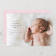 Det här födelsemeddelandet innehåller enkel text med sidorientering. Baksidan har en redigerbar rosa färg med plats för ett annat foto.