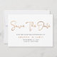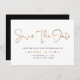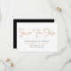 Modern minimalistisk kopparskript i guld sparar datumkortet. Detta kort för elegant innehåller handskript i koppar guld färg på vit bakgrund och uppgifter om bröllop och namn skrivet i versaler i svart färg. Kortets baksida är djupt svart. Om du vill redigera mallen klickar du på anpassa ytterligare.