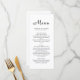 Förbättra din bröllop-matupplevelse med våra enkla, rena, minimalistiska Bröllop-menykort! Med elegant skriptcalligrafi för rubriker och skarp svart text på en pristinvit bakgrund blandar dessa kort läsbarhet med underskattad sofistikering. Anpassade med dina menyalternativ och namn, så kompletterar den här minimalistiska designen utan problem ditt bröllop-kontorsprogram. De finns som tryckta kort och erbjuder praktisk elegans för det moderna par. Matcha ditt tema utan ansträngning samtidigt som du ser till att gästerna sparar alla detaljer i firande.