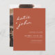 I höjden av pandemin, där det inte är tillåtet att samlas, är det bara inbjudan som är era vänner och nära anhöriga till ett virtuellt firande i bröllop med detta moderna vykort för inbjudan till chic i årets mest tragiska tema i bröllop färg, Terracotta. Den har en kalligrafisk avslappnad av namn och bild i bak.