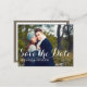 Vacker kursiv typografi och enkel styling på detta foto vykort presenterar ert förlovningsfoto, och "Spara datum" information i vit text på framsidan. Mjuk neutral grå/brun färg på baksidan med utrymme för alla viktiga detaljer; bröllopsdatum, webbplats och ett personligt meddelande.
