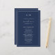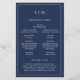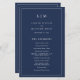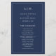 Ett enkelt Bröllopsprogram med en modern utformning av eleganten med två brev-monogram överst och dina detaljer omgivna av ett tunt gräns. All text är vit över en marin blå bakgrund och kan ändras i designredigeringen i verktyg. Framsidan har din ceremoni och baksidan har din bröllopsfest och tack för ditt budskap. En chic och snyggt som är underbar för ett minimalistiskt par. Dessa bröllopsprogram i billigten trycks på lakan av papper för ett budgetvänligt alternativ.