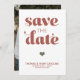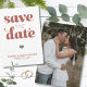 Fritt: Minsta "spara datumet" och parets namn, bröllop i terracotta. Ett enkelt hjärta av grönt mellan de två. Tillbaka: förlovningens favoritfoto av lycklig-paret.