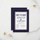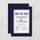 Modern, enkel och elegant faux tryckt ro guld streck på marint blått och vitt Spara-datum-bröllop-kort. Denna klassiska och sofistikerade utformning är perfekt för det trendig och det snyggt som gifter sig. Anpassa med ditt eget meddelande på framsidan och en anpassad inledande monogram på baksidan. All fotoutskriftsdesign.