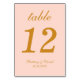 En bordnummer skylt för roségult bröllop med roségula och guld detaljer. Det är en text i guld på en rosafärgad bakgrund. Allt förutom numret är skrivet i en elegant kalligrafisk stil.