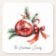 Den pappra juljulen underlägg för jul party eller barware med en enkel manusfamilj namn och en vattenfärgad årgång julprydnad med gräs och snö.