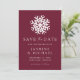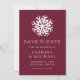 Lägg märke till ditt vinterbröllop i stil med vårt enkla snöflingande Vin spara datumet. Med en fet vit snöflinga och "Spara datum" i elegant serif och kalligraphy-text på vin-färgadens bakgrund, fångar den här designen vinterns skönhet. Anpassa med namn, datum och plats i bröllop nedan. Perfekt för vinter, helgdag och jul-bröllop, detta sparande anger tonen för ett magiskt firande.