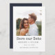 Ett enkelt foto med elegant sparar det datum som innehåller det bästa fotot på förlovningen över en vit bakgrund. Kortet går tillbaka till ett fast marint blått färg som är helt utbytbart för att passa bröllop eller fotot färg. Anpassa med namn, datum och plats för bröllop.