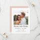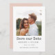 Ett enkelt foto med elegant sparar det datum som innehåller det bästa fotot på förlovningen över en vit bakgrund. Kortet går tillbaka till en solid rosa färg, helt utbytbart för att passa bröllop eller färg. Anpassa med namn, datum och plats för bröllop.
