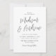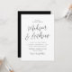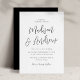 Minimalistiska bröllopsinbjudningar med namn som visas i ett enkelt svart skript med uppgifter om bröllop visas nedan. Inbjudan går tillbaka till en solid svart bakgrund.