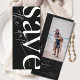 Dessa 4 x 8-tumsdisketter för att spara datumkorten har en minimalistisk design i eggshell-vit och grått-brev på en svart bakgrund med platshållare på baksidan för det förlovade paret namn, bröllop-datum, platsinformation och ditt favoritfoto!