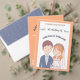 Bröllopbjudan innehåller en charmerande illustration av en brud och en brudgumm. Gumman är skild med kort brunt hår, en lätt färg, och bär en marin blå kostym jacka över en ljusblå, färgad skjorta och vit slips. Han har en liten boutonniere fäst vid sin lapel. Bröden står bredvid honom och ler sött. Hon har vågigt, rödaktigt orange hår med en blomma krona av rosa, orange och vita blommar. En känslig vit slöja flödar bakom henne. Hon bär en vit bröllop-klänning med en raring-halsband och ett pärlhalsband. Den här enkla, tecknad-liknande illustrationen visar en tråkig koppling mellan dem. Det är nyttigt och uppseendeväckande, och det är en glatt ton för det kommande bröllop. Inbjudningstexten är så minimal som möjligt för att skapa en allmän känsla där kärlek är det enda viktiga inslag! Hela fält är fullt anpassade. Du kan lämna tömma fälten som du inte vill använda på (till exempel osan om du föredrar ett avskilt kort )