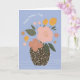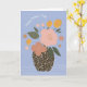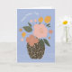 Det vikta hälsningskortet i Mors dag har en abstrakt och en modern illustration av rosa och gula blommor i en svart och vit polkpunkt vas på söt blå bakgrund. På framsidan står bara "Lycklig Mors dag" och på insidan tillfogas "Tack för att du hjälpte mig att blomma" och en andra illustration av ett vas med en enkel blomma arrangemang.