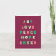Ett modernt, fetstilt och färgrikt julkort i rött och grönt med orden "glädje, kärlek, fred, hopp, glädje". Insidan av kortet har plats för ett foto och ditt eget meddelande.