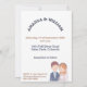 Bröllopsinbjudan har en charmig illustration av en brud och en brudgumme. Brudgummen avbildas med kort brunt hår och ljus hy, och bär en mörkblå kavaj över en ljusblå skjorta med en vit slips. Han har en liten boutonniere fäst vid kavajens slag.