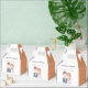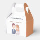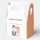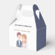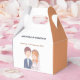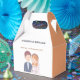 Denna vackra presentbox för bröllopsgästerna har en charmig illustration av en brud och en brudgum. Brudgummen är avbildad med kort brunt hår och ljus hy, och han bär en marinblå kavaj över en ljusblå skjorta med en vit slips. Han har en liten boutonniere fäst vid sin rockslapp.