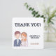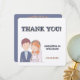 Dessa bröllopskort med tackmeddelande har en charmig illustration av en brud och en brudgum. Brudgummen är avbildad med kort brunt hår och ljus hy, och bär en marinblå kavaj över en ljusblå skjorta med en vit slips. Han har en liten boutonniere fäst vid kavajens slag.