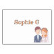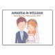 Det här platskortet har en charmig illustration av en brud och en brudgumme. Brudgummen är avbildad med kort brunt hår och ljus hy, och han bär en marinblå kavaj över en ljusblå skjorta med en vit slips. Han har en liten boutonniere fäst vid kavajens slag.