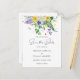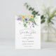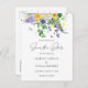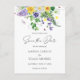 Detta är ett enkelt och rustikt vildblomsräddningskort för bröllop. Designen har en mängd olika vårblommor, inklusive gula narcisser, lila penséer, klöver, lavendel, sötärt, maskrosor, tulpaner och ormbunks- och murgrönsgreenery. Den innehåller också några nyckelpigor, en söt trollslända och ett personligt meddelande på baksidan.
