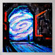 En ensam glödande figur som står bredvid ett fönster med spiral galaxi utanför. Original är här: https://www.dailypaintworks.com/fineart/alexandra-cook/alone-with-the-shiny-abyss-/855672