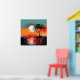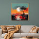 Denna stämningsfulla konstnärliga verk fångar en tyst moment av ensamhet under en lysande solnedgång. En ensam figur står vid vattnets kant bredvid ett vindpinat träd, silhuetterad mot en vid himmel målad i varma nyanser av bränt orange, korallröd och mjukt guld. Den överdimensionerade solen hänger lågt vid horisonten, dess ljus reflekteras över sjöns stilla yta och skapar en drömlik spegel av färg och känsla.
