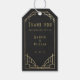 Add a touch of vintage sophistication to your celebration with this elegant Art Deco thank‑you tag. Designed in deep black with faux gold geometric detailing, it features customizable messages, names and date. The celestial‑inspired layout and refined typography make it perfect for weddings, anniversaries, or formal events. Printed with a non‑metallic faux gold finish for a luxurious look without foil printing. Pair with matching invitations or place cards for a cohesive suite.