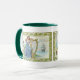 Vintage St. Patrick's Day-mugg med gaelisk text: "Erin Mavourneen! Sweet Erin Go Bragh!" och en vacker bild av en irländsk kvinna som spelar harpa med sin hund bredvid och ett fartyg som seglar på havet i bakgrunden.