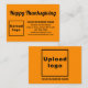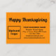 Glad Thanksgiving! Högtid för att fira i november för att tacka för de välsignelser som vi har fått. Det är också en av högtiderna för att marknadsföra ditt företag. Bifogad kort som du kan anpassa för att sätta ditt företags varumärke och med Thanksgiving-hälsning. Anpassa det och använd det för att hälsa dina kunder eller klienter på denna Thanksgiving och som marknadsföringsmaterial för att annonsera ditt företag eller för att främja ditt varumärke. Du kan också använda det som tillbehör till förpackningsmaterial för din produkt. Anpassningsbart bifogat kort som du kan använda för att bygga varumärkesmedvetenhet. Designfärger är svart text på orange bakgrund. För att anpassa detta bifogade kort, ladda upp din företagslogotyp, skriv ditt företagsnamn, adress, telefonnummer, e-post och webbplats eller din företags sociala mediesida. Kontrollera utseendet på fram- och baksidan efter att du har laddat upp logotyp och skrivit text. Om utseendet är tilltalande för dig kan du lägga din beställning nu. Om du behöver ändra storlek och flytta logotyp och text för att passa på detta bifogade kort eller på den storlek du väljer, ändra det i designverktyget. Du kan också ändra