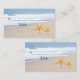 Snyggt eskortera platskort till din avslappnad strand bröllop. Den har ett foto av en strand med blå vatten, vitt skum och bisand och ett par stjärnfiskar på den. Det är ett underbart val för ditt målbröllop bord.