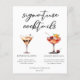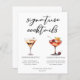 Den här sofistikerade menyn för namnteckning cocktails på lakan har enkel svart typografi över 2 av dina favoritdrycker och deras ingredienser för bröllop pub vid kusten. En chic Espresso Martini och Cherry Fransk 75 teckning lägger till roligt flair till pub-menyn. Fyll i med parets namn och mottagningsdatum.