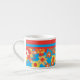 En Espressokaffe Mugg med ett glansigt mönster med rött, orange och gula blommor på en ljus turkobakgrund, från ett handmålat pappert kollage av Judy Adamson.