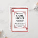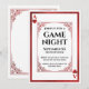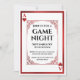 Denna Game Night-partygästlista har en klassisk spelkortdesign. En utsmyckad, vintageinspirerad ram omger det centrala textområdet. En matchande röd foliedesignram pryder inbjudan. Två röda hjärtan och ess-monogrammet är tryckta i motsatta hörn, i likhet med layouten i en kortlek.