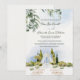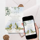 Designed with cascading botanical greenery at the top and a hand-painted pavilion setting below, this invitation beautifully captures the charm of estate, vineyard, and garden venue weddings. The soft blue sky backdrop and classic typography pairing create a refined, timeless aesthetic perfect for formal outdoor celebrations.