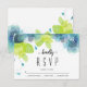 Blå och teala eteriska blommor blommigten vår bröllop OSA kort. Överdelen är täckt av en bukett av blåa blommor med grönt löv.