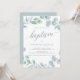 En elegant dopinbjudan i dammig blå och vit, med akvarell eukalyptusblad och "dop" i dammig blå modern kalligrafi. Personifiera med dina detaljer i grått.
